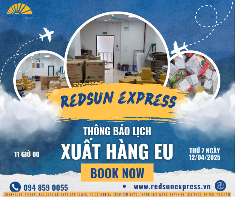 Công ty CPN Quốc tế RedSun Việt Nam xin trân trọng thông báo lịch xuất hàng chuyển phát nhanh chuyên tuyến Việt Nam – Châu Âu ngày 12/04/2025 của chúng tôi cụ thể như sau: