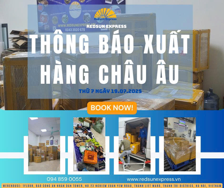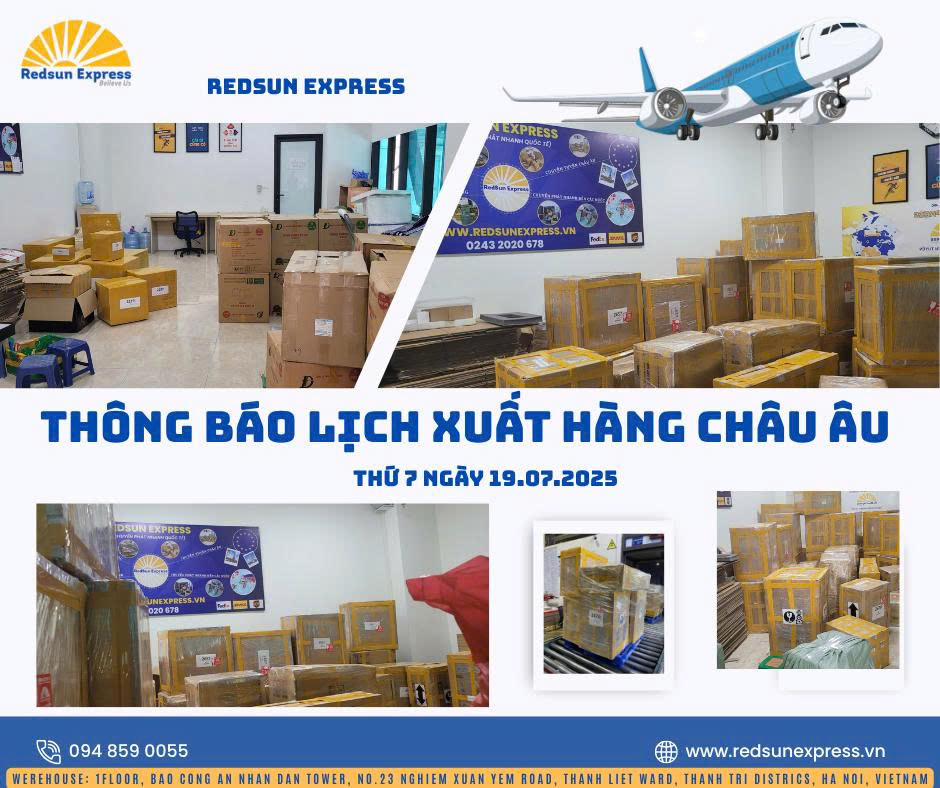 Công ty Vận chuyển quốc tế RedSun Việt Nam xin trân trọng kính báo đến toàn thể quí khách hàng lịch xuất hàng chuyên tuyến Châu Âu (EU). Thứ 7 ngày 19 tháng 7 năm 2025, cụ thể như sau: