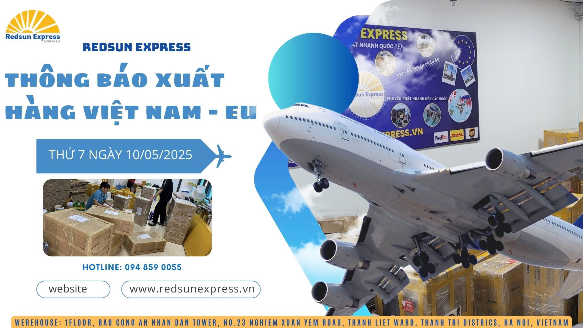 Công ty CPN Quốc tế RedSun Việt Nam xin trân trọng thông báo lịch xuất hàng chuyển phát nhanh chuyên tuyến Việt Nam – Châu Âu ngày 10/05/2025 của chúng tôi cụ thể như sau: