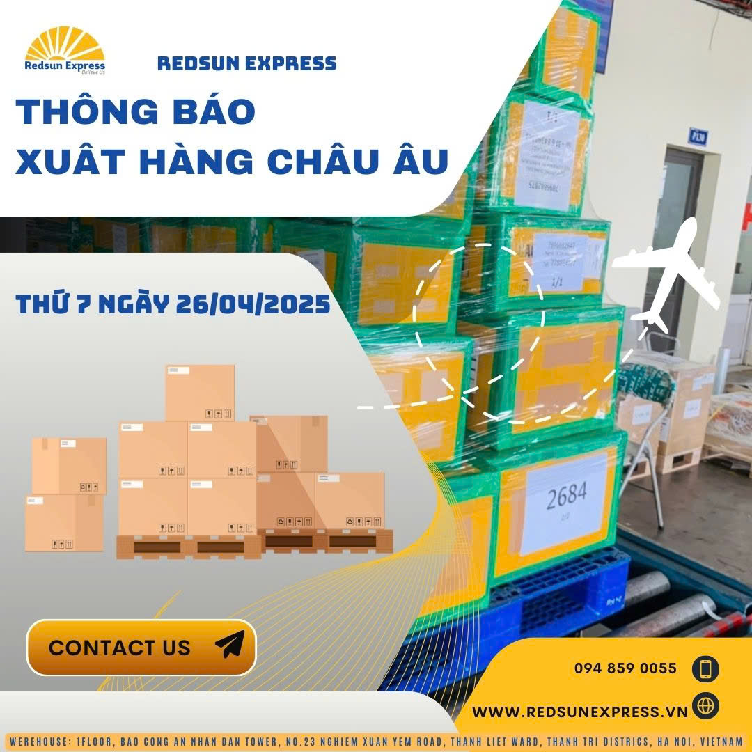 Công ty CPN Quốc tế RedSun Việt Nam xin trân trọng thông báo lịch xuất hàng chuyển phát nhanh chuyên tuyến Việt Nam – Châu Âu ngày 26/04/2025 của chúng tôi cụ thể như sau: